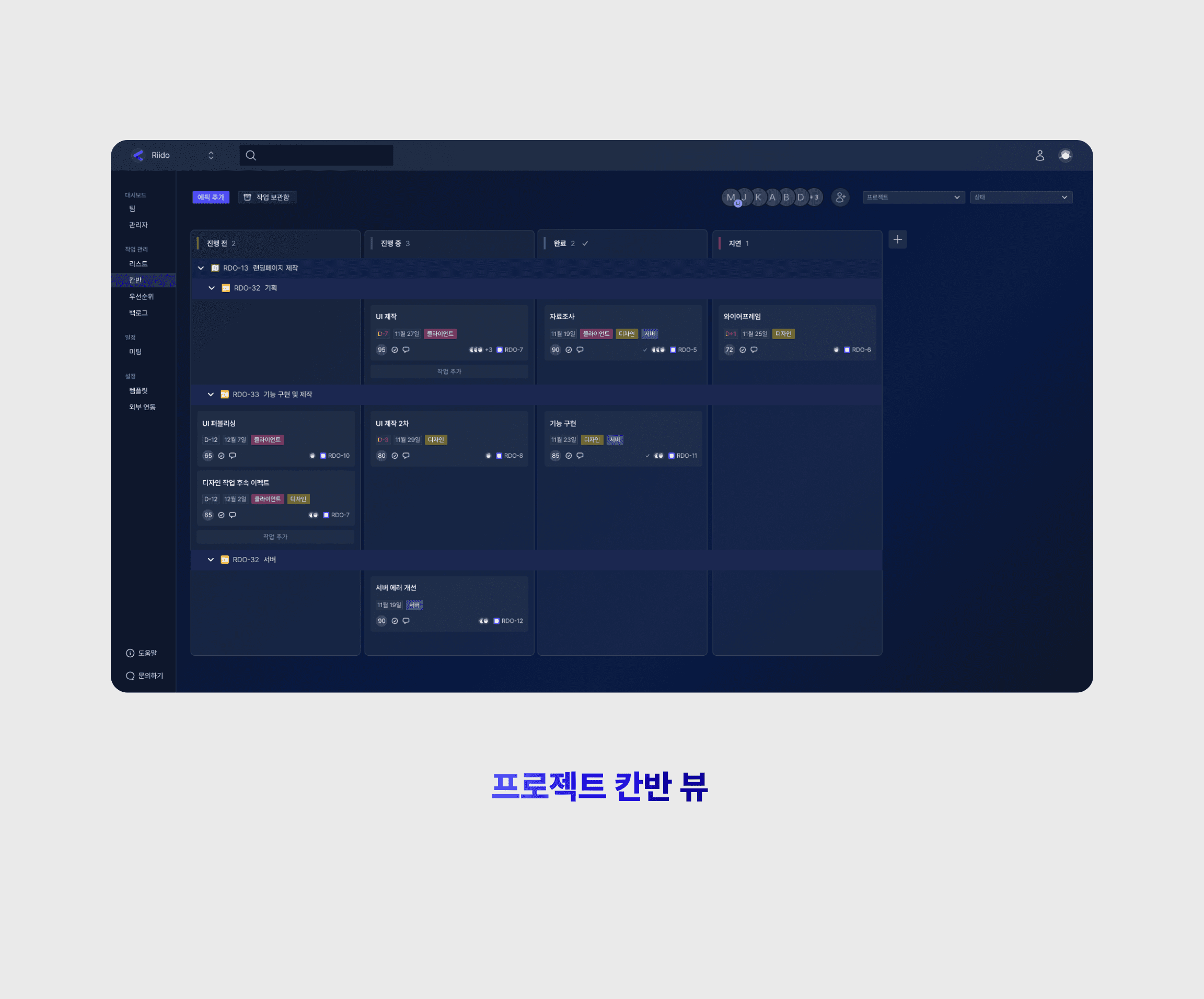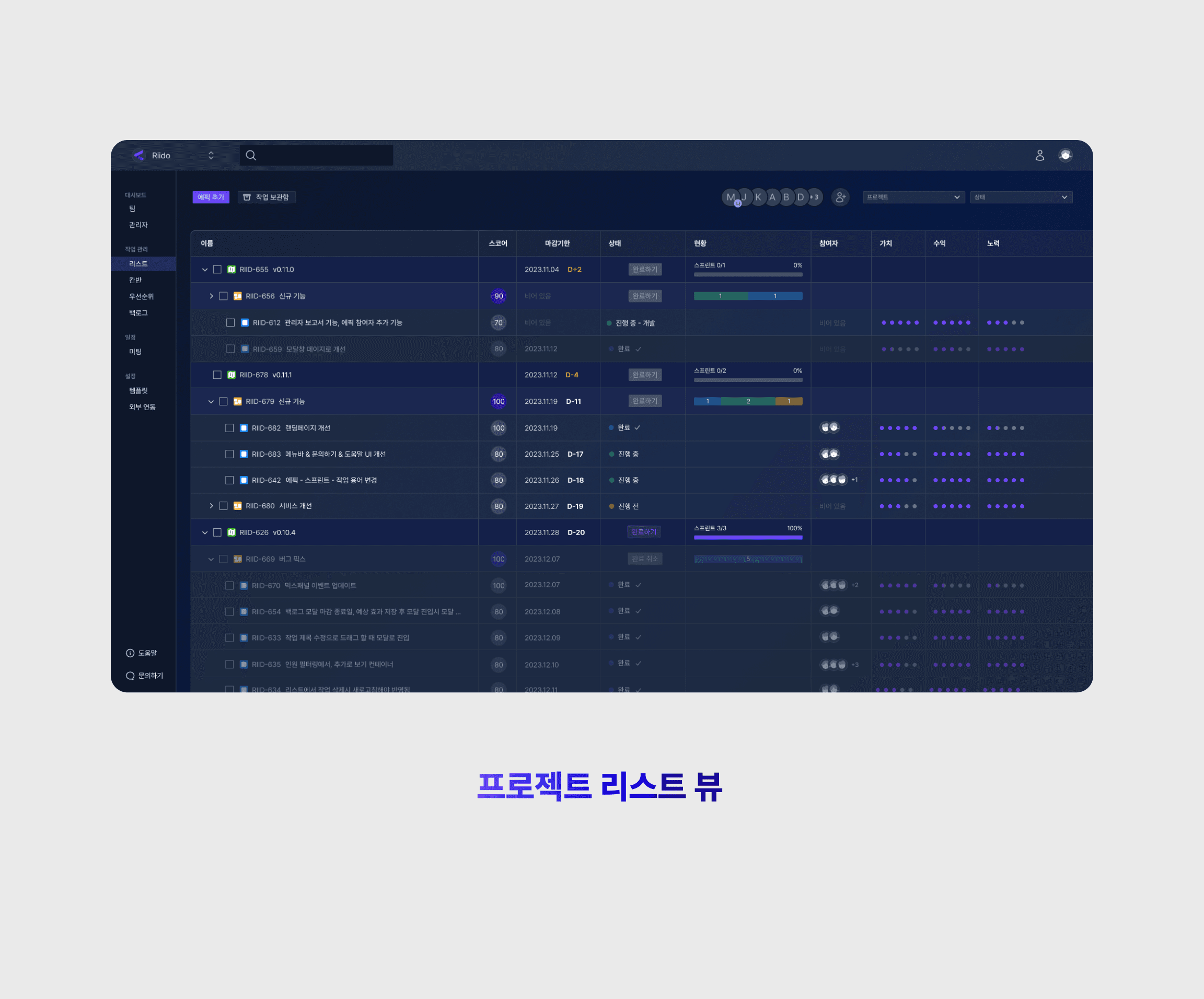 Riido는 툴 학습 난이도를 대폭 낮춰 지금부터 바로 개발 프로세스를 체계적으로 관리할 수 있게 합니다.